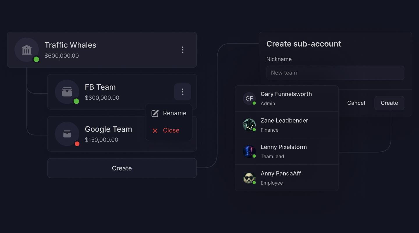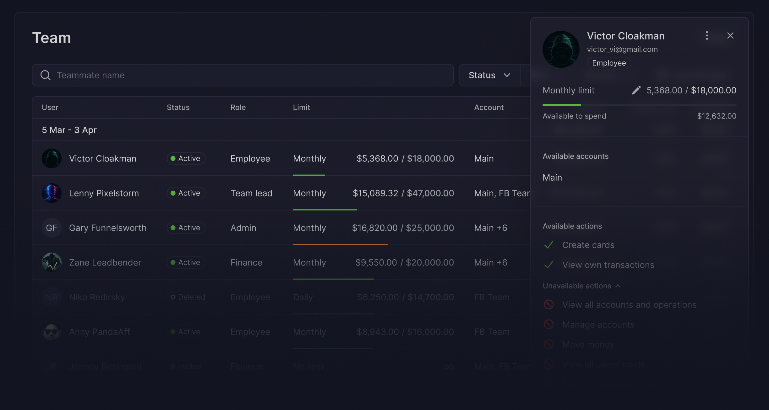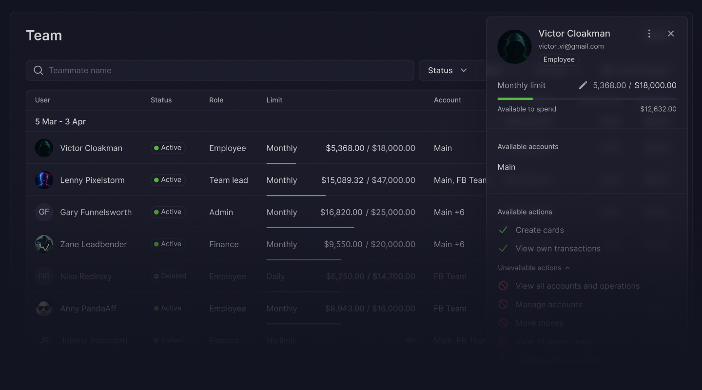 Розділ «Команда» відображає всіх користувачів, їх ролі, ліміти, рахунки й активність. Групування та фільтри допомагають бачити те, що потрібно і аналізувати роботу та структуру внутрішніх команд.
